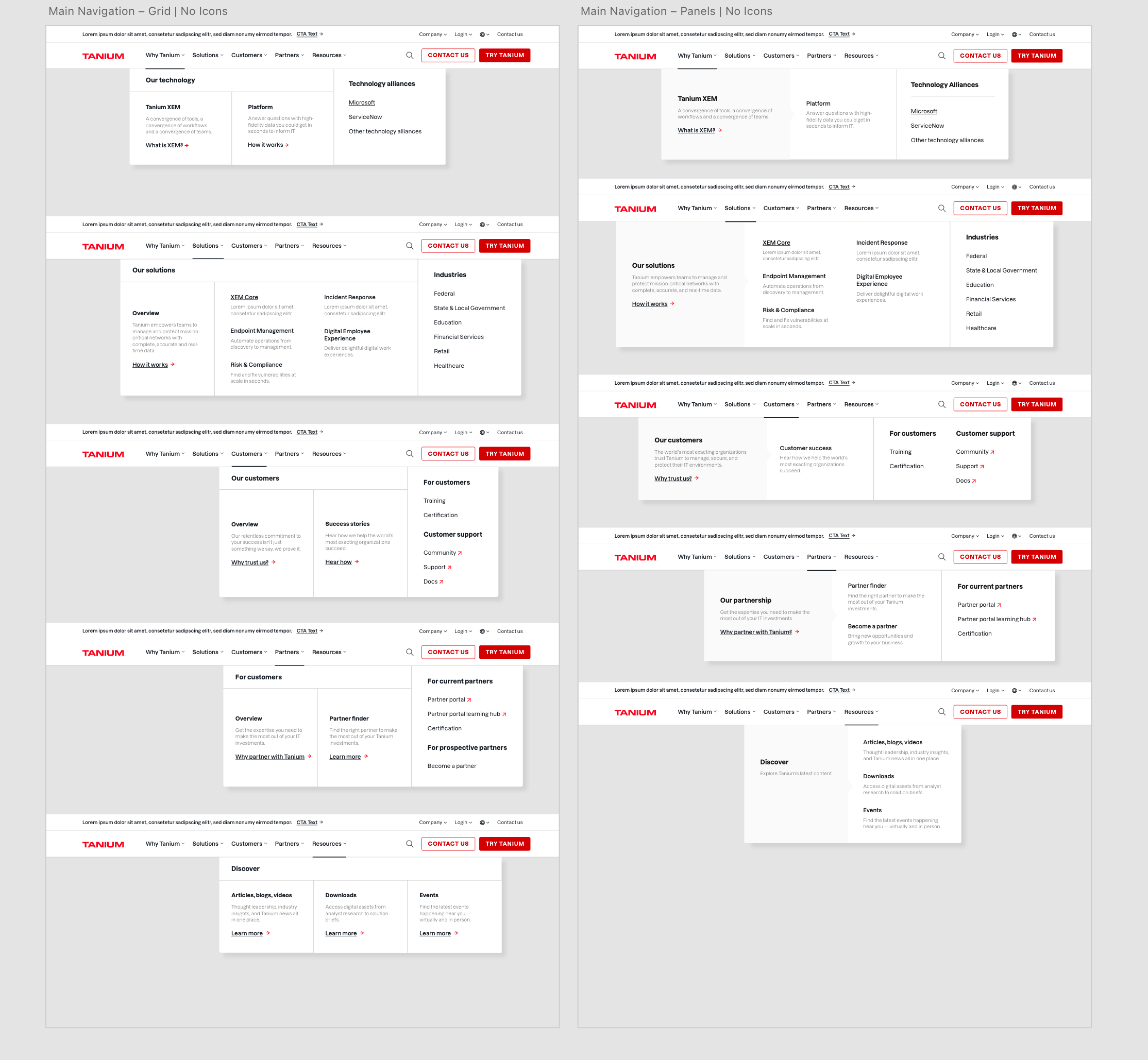 Added ‘overview’ panels to create more visual emphasis on L1 pages and how they related to the L2 links within the same dropdown. Removed the utility nav which was mainly corporate information links since Tanium was trying to move away from establishing brand awareness and into brand consideration/equity.