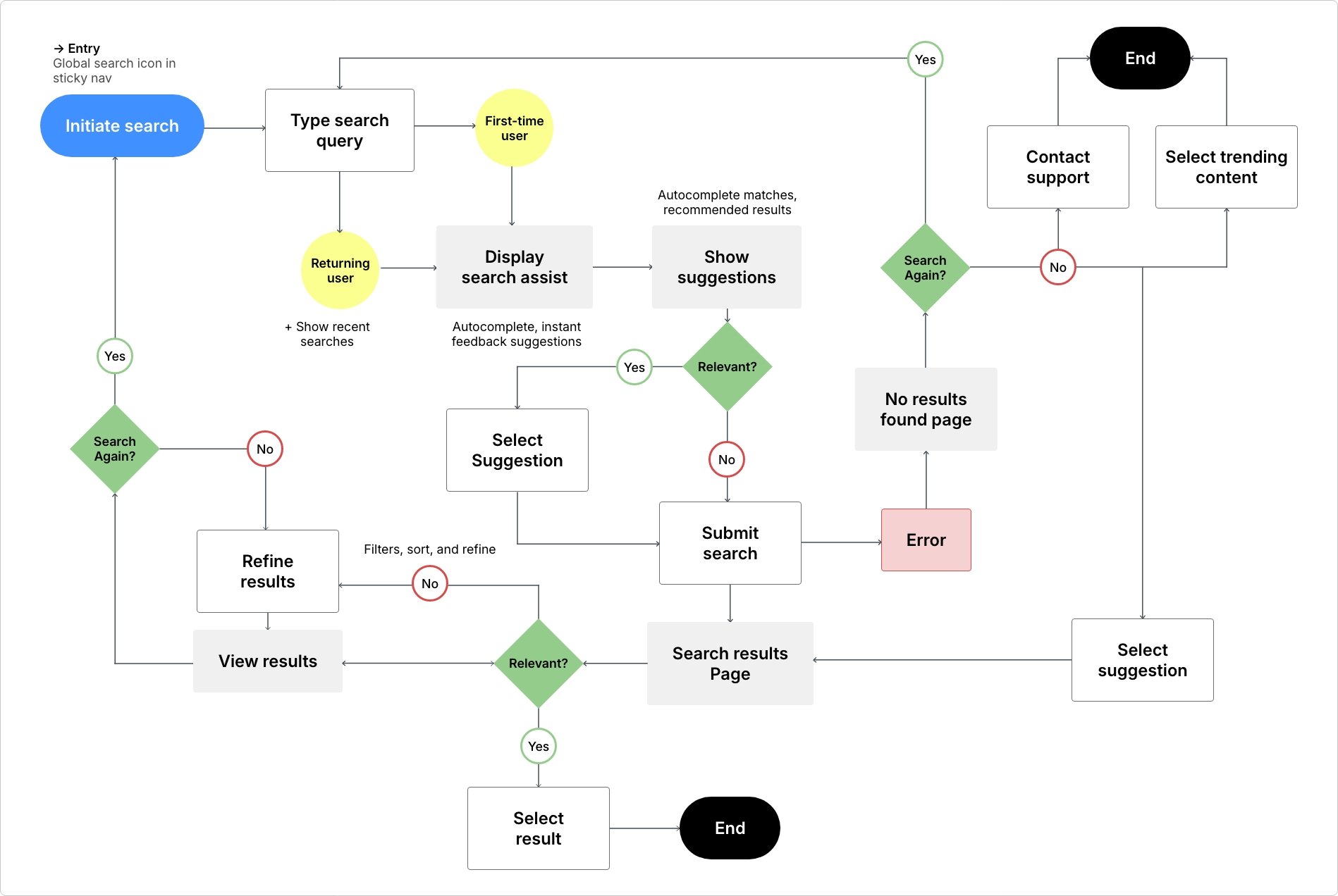 (mapping how users enter a query, receive suggestions, view filtered results, and adjust search criteria)